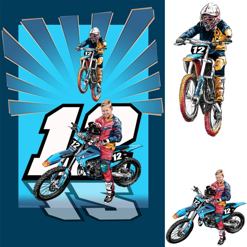 Een goede vriend wou graag portretten van zijn kinderen en hun hobbies. Deze illustraties heb ik op verzoek op posterformaat laten drukken, zodat ze ingelijst konden worden. Op canvas was een andere optie geweest.